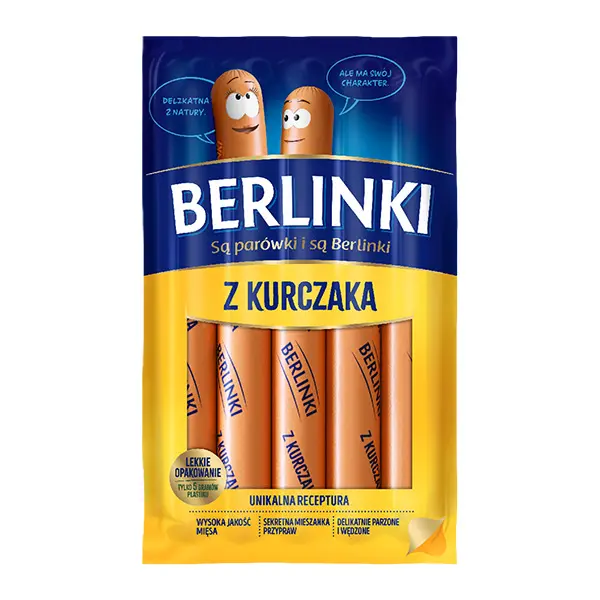 Berlinki-Hühnchen-Würstchen zeichnen sich durch eine einzigartige Rezeptur aus. Die hohe Qualität des Fleisches, eine geheime Mischung aus Gewürzen, ein schonendes Brühverfahren und das Räuchern verleihen ihnen einen ausgezeichneten Geschmack und eine zarte Konsistenz. Berlinki ist die beliebteste Würstchenmarke in Polen und führt sowohl in quantitativer als auch in wertmäßiger Hinsicht in ihrer Kategorie. Der Geschmack von Berlinki ist das Ergebnis einer einzigartigen Rezeptur. Die hohe Qualität des Fleisches, eine geheime Mischung aus natürlichen Gewürzen, der präzise Brühprozess bei kontrollierter Temperatur sowie das Räuchern mit Buchenholzrauch sorgen dafür, dass die Berlinki-Würstchen hervorragend schmecken und eine zarte Konsistenz haben.