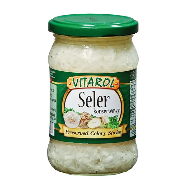 Der konservierte Sellerie von Vitarol behält seinen charakteristischen, würzigen Geschmack, seine Festigkeit und seine appetitliche Farbe dank einer milden Essiglake. Er ist saftig und aromatisch, natürlich, ohne Konservierungsstoffe. Sellerie ist eine reichhaltige Quelle für Vitamine C, A, E und B. Er enthält Kalzium, Magnesium und Eisen, pflanzliche Antioxidantien. Konservierter Sellerie kann zu Suppen, Salaten, Rohkost, Pizza und Sandwiches hinzugefügt werden.