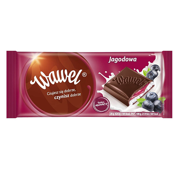 Heidelbeer-Joghurt-Schokolade von Wawel ist die perfekte Kombination aus edler Zartbitterschokolade und einer zweischichtigen Heidelbeer-Joghurt-Füllung.