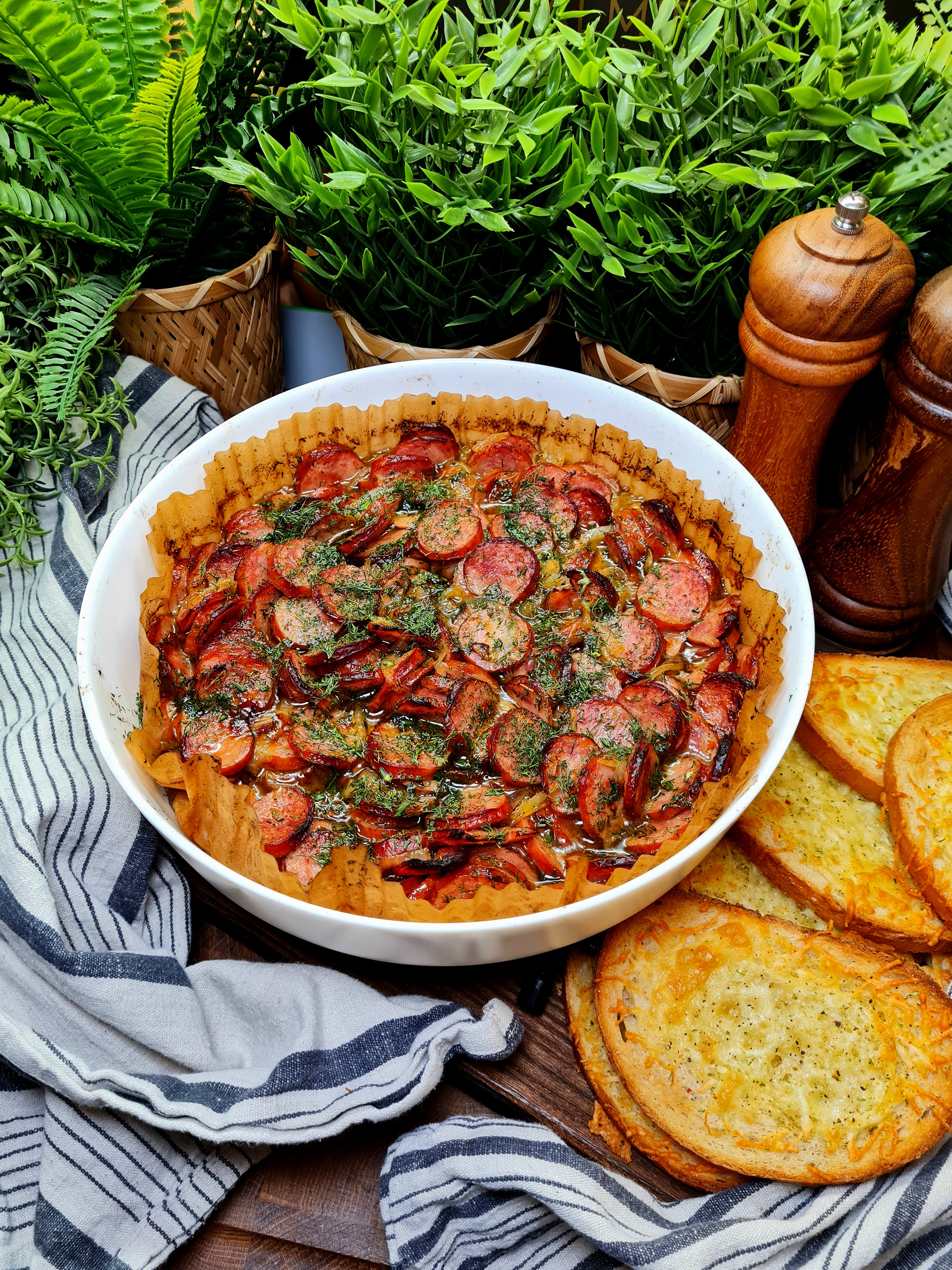 Die Wurstscheiben in einer heißen Pfanne goldbraun anbraten, die Zwiebeln hinzufügen und mitbraten, bis sie weich und leicht gebräunt sind, mit Salz, Pfeffer und Majoran würzen und gut vermengen, in eine ofenfeste Form geben, mit frischem Dill bestreuen und im vorgeheizten Backofen bei 180 °C ca. 10 Minuten backen.